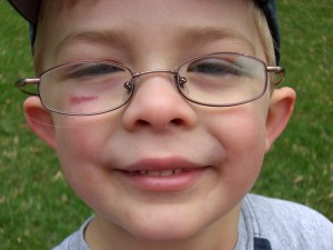 About a week ago now, Franklin came home with the weirdest glasses-related wound I’ve ever seen (look under his left eye). Apparently, one of the girls at daycare somehow hit his glasses with her shoulder and jammed them right up into his cheek. Details are fuzzy, but the resulting cut was very strange. Has anyone else seen anything like this? It was like the bottom part of his glasses cut into his cheek and left several slices or crack-like cuts. The lenses don’t feel sharp, but I don’t know how else this could have happened. We actually thought it would bruise worse than it did, it was mostly this little ridge of crease-cuts. In all my years of glasses, I’ve never seen anything like it. Maybe the glass created the cuts by rug-burn? I’m not sure, it’s just weird.