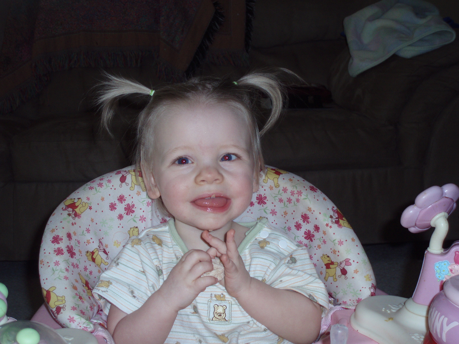 Mckenna, now 15 months, does not like strangers to touch her. They put drops in her eyes and then we waited and waited to be seen again. Once we were brought back she didn’t want anything to do with the exam. After laying her down and holding her arms down, the doc peeled open her eyes to look at them. I have never heard my daughter cry like that! I make my husband take her to her vaccine appointments! But the minute he was done touching her she was ok. I was still upset- but she was ok. He said that we should try glasses and for me to look up the eye muscle surgery on his website. I was very confused at this point. I asked about an eye patch and he said that that was for vision- that confused me even more! We scheduled a follow-up appointment and in a whirlwind it was over. Later that afternoon, after I calmed down, I realized that I hadn’t even gotten a diagnosis from the PO! All I could process was that he said her eye is crossing in and that she isn’t using it or else she would have double vision. The sad thing is that I work in the medical field!! Well, I looked up everything I could about Strabismus and Amblyopia. Since the rx he wrote out was for +4 in both eyes, I concluded that she was farsighted. Also that since her eye crosses in occasionally, seemingly due to farsightedness I figured it sounded like Esotropia. I called the doc back the next day and turned out I was right- Left eye Esotropia (possibly accommodative). The only thing that leaves me wondering is that he said she wasn’t using that eye- but the consult note doesn’t say anything about Lazy eye. Also, she does move that eye- and today her left eye was straight and right was pulled in. He did however write the rx as +4 for both eyes- so it is quite confusing. I will trust him though. My husband wanted to pummel him however.