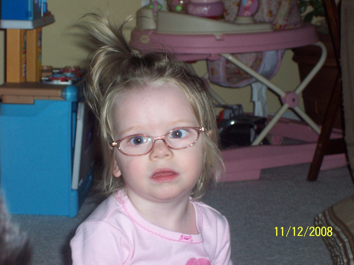 Ok- Well, we have had a horrible time getting McKenna’s first pair of glasses. From waiting 5 weeks to get them, to the clerk at Sears stashing them in a drawer; not sending them, and then quitting without so much of a note to another clerk to send them. But they finally came back with the lenses today, although we are taking her to get them fitted and the temples rounded to fit around her ears, I had to take pictures!! I put them on her and she left them on for about 15 minutes while I was holding her in my lap. When she was on the floor and trying to crawl however, they began to slip, so she quickly pulled them off. She did though bring them to me to put them back on her, but they wouldn’t stay on. I am hopeful that once they are fitted more properly, that she will forget that they are there and leave them be. Then we will focus on the benefits of the prescription and its effect on her esotropia and farsightedness.