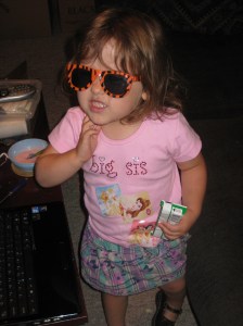 How to tell Zoe just got out of an eye appointment? Sunglasses and lots and lots of stickers. The eye doctor’s office has a ready supply of both.