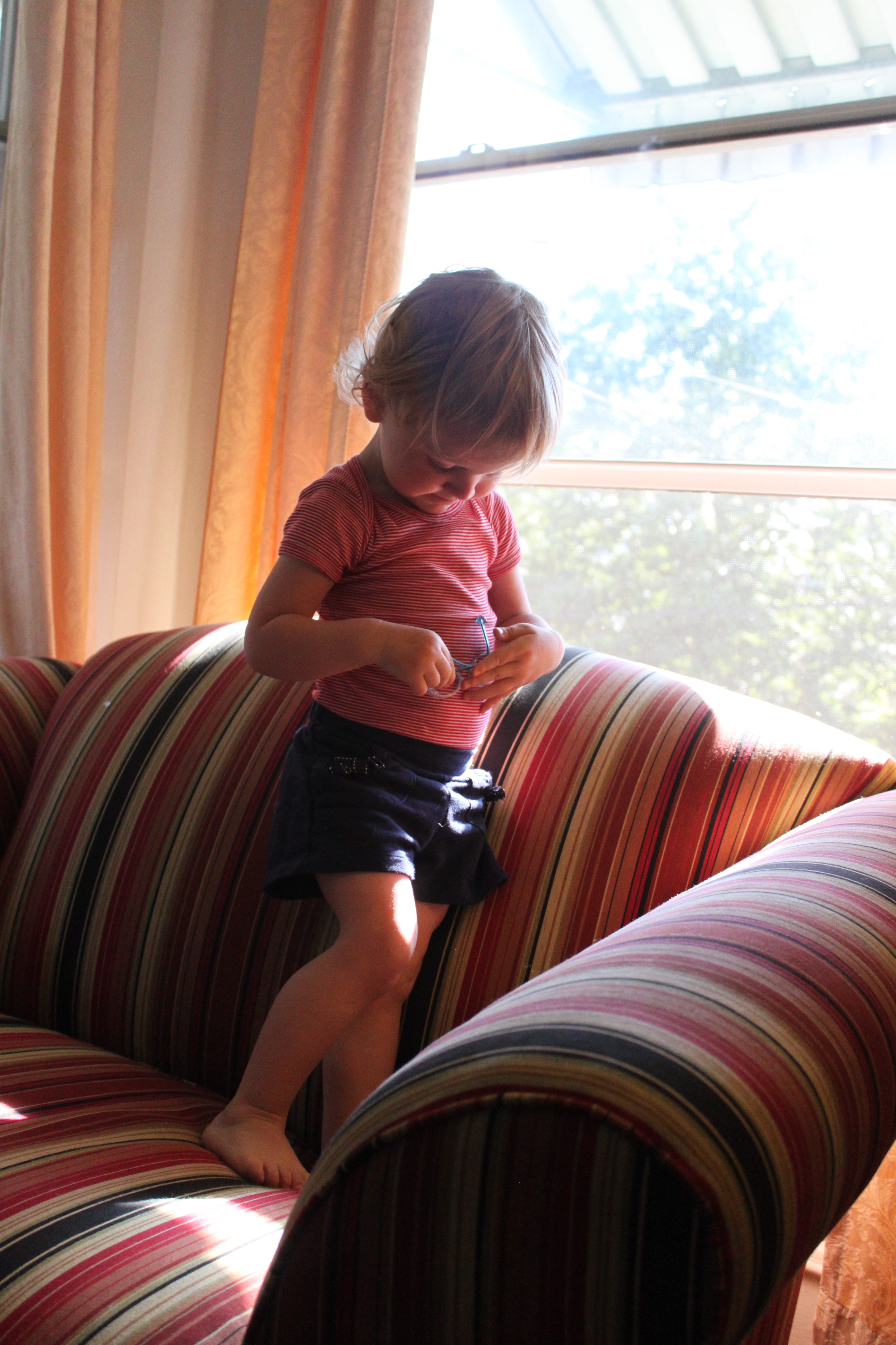 I’ll admit that so far, it’s been hard to do the vision exercises at home. Sometimes, impossible to the point of my wanting a glass of wine at 3pm. Stella’s attention span and patience are not only low due to her age, but because the activities we’re supposed to do are uncomfortable for her. Of course, that’s the point–to challenge her eyes and make them work harder and in ways that are currently outside her left eye’s relatively narrow comfort zone. For instance, we were supposed to play catch with the balloon for a bit each day, as we did in the office. But after a few days, she simply refused to even look at the balloon , no matter how hard I tried to entice her. Sadly, I found myself on my hands and knees, begging and pleading for a good ten minutes, and near tears at one point, to no avail. Pathetic image, I know. Even chocolate chips, previously very compelling rewards, no longer held any sway. Today, Stella’s vision therapist, who’s been wonderful about answering my questions via email, explained that Stella’s resistance is normal. It takes a while for little ones to go get with the program, much like the period of adjustment and gradual acceptance of glasses and patching. By providing a variety of fun activities and not forcing things too much, I hope that eventually, we can make home vision therapy an enjoyable and regular part of each day. The therapist asserted that the benefit of doing vision therapy at this age is that they respond so quickly, and noted that it’s very exciting and gratifying to see their progress unfold.