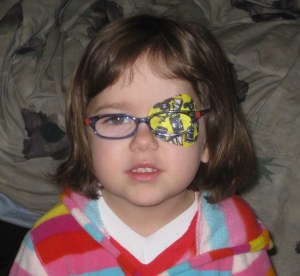 Zoe started patching at daycare the same day that she moved from the preschool room to the pre-kindergarten room. When I emailed the daycare center the day we learned she’d start patching, the director called and asked if I thought we should delay Zoe’s move to the pre-k room until she’s done patching. I couldn’t think of anything worse to do – she’d been looking forward to moving to the next room with the big kids, and telling her we were delaying because of patching is a sure way to make her really resent patching even more. We decided to patch first thing in the morning, so that we could put the patch on, and her teacher would only need to take it off later that morning.