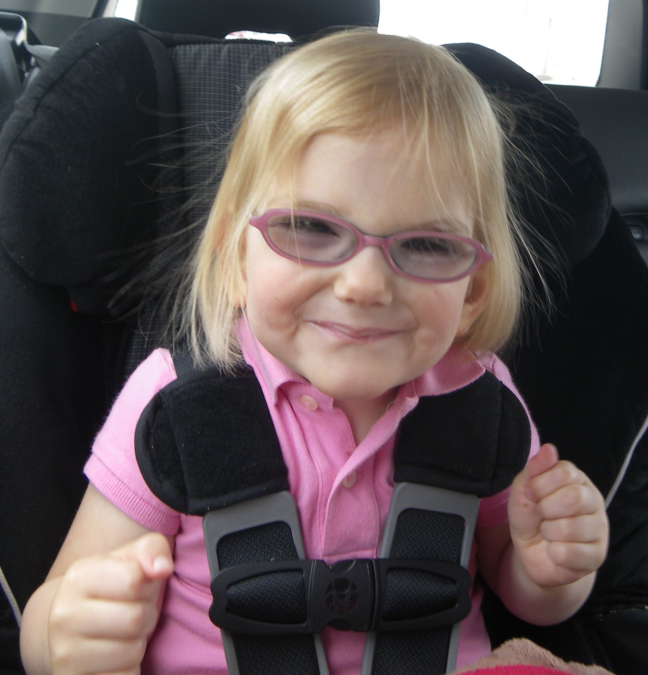 My nearly four-year-old daughter Isabella has multiple ocular diagnoses: severe hyperopia (farsightedness), astigmatism, mild macular hypoplasia (“underdevelopment of the macula, a small area on the retina responsible for seeing in detail” – read more) , latent nystagmus (“involuntary rapid movement of the eyeball, occurring only when one eye is covered” – read more), and intermittent exotropia (“eyes that turn outward” –  read more).  She began seeing an ophthalmologist at six weeks old and received her first pair of glasses at 15 months. Today at nearly age four, her acuity measures about 20/70 with correction. Isabella also has bilateral sensorineural hearing loss, childhood apraxia of speech (a motor speech disorder),  hypotonia (low muscle tone), and fine and gross motor delays.