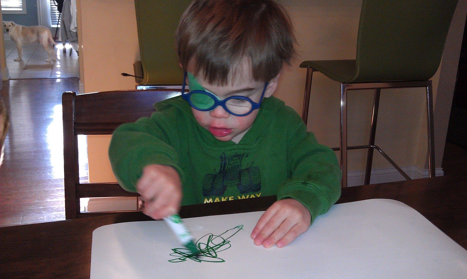 I think the whole “green” thing is a way to at least have a little bit of control over the situation Sort of, I have to wear an eyepatch, but at least I get to pick the color. That, or the fact that he is 2 and 2 year olds have no logic.