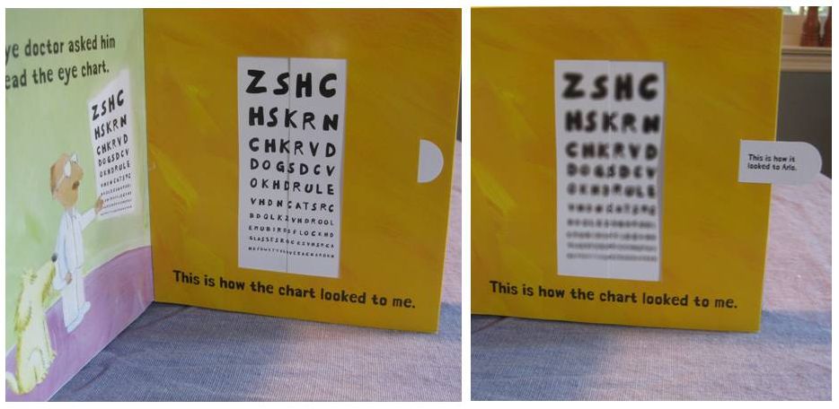 But first, the story. The story is a fictional tale about Saltzberg’s dog, Arlo. Arlo used to be great at catching balls, but one day, Arlo stopped being able to catch the balls. After trying a few different things to help him, the narrator decides that Arlo must need glasses. You get to see some of the tests and equipment that Arlo uses at the eye doctor’s, and once it’s confirmed that Arlo needs glasses, you get to see, and try on some of different frame styles for Arlo.