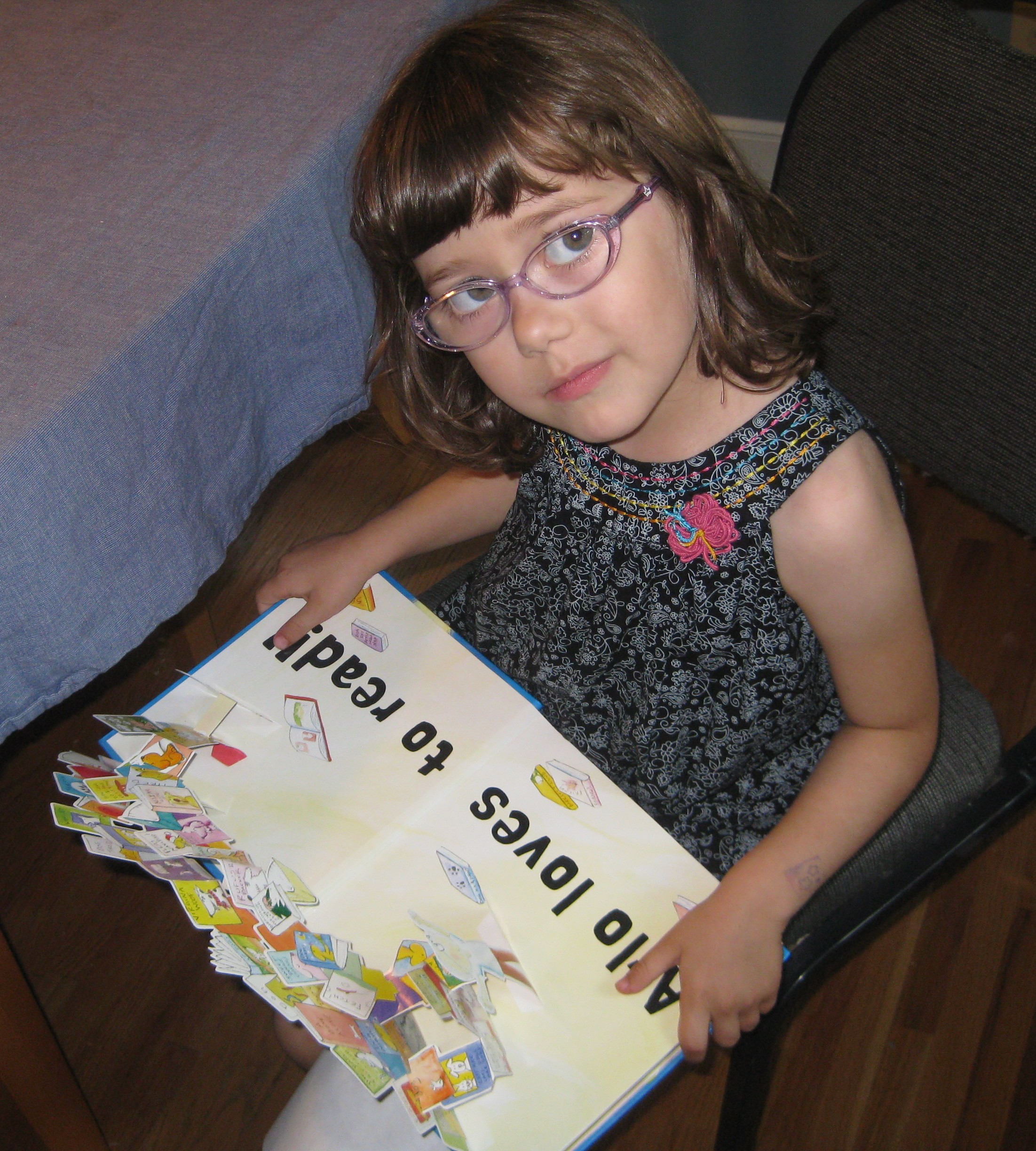 I had wondered whether this book would be a little young for Zoe, at 5 1/2, since she’s now very much in to chapter books (especially if they’re about fairies). But she grabbed the book from my hands and immediately started reading it and trying out all the different things about it. When she got to the page where Arlo tries on different pairs of glasses (“movie star”, “super hero”, and “mad scientist” styles), I heard her exclaim, “Nice! Oh, yeah! Really nice!” She’s asked for us to read it multiple times, and reads it to herself quite a bit, too. She was also excited to tell friends about it when they saw the book.