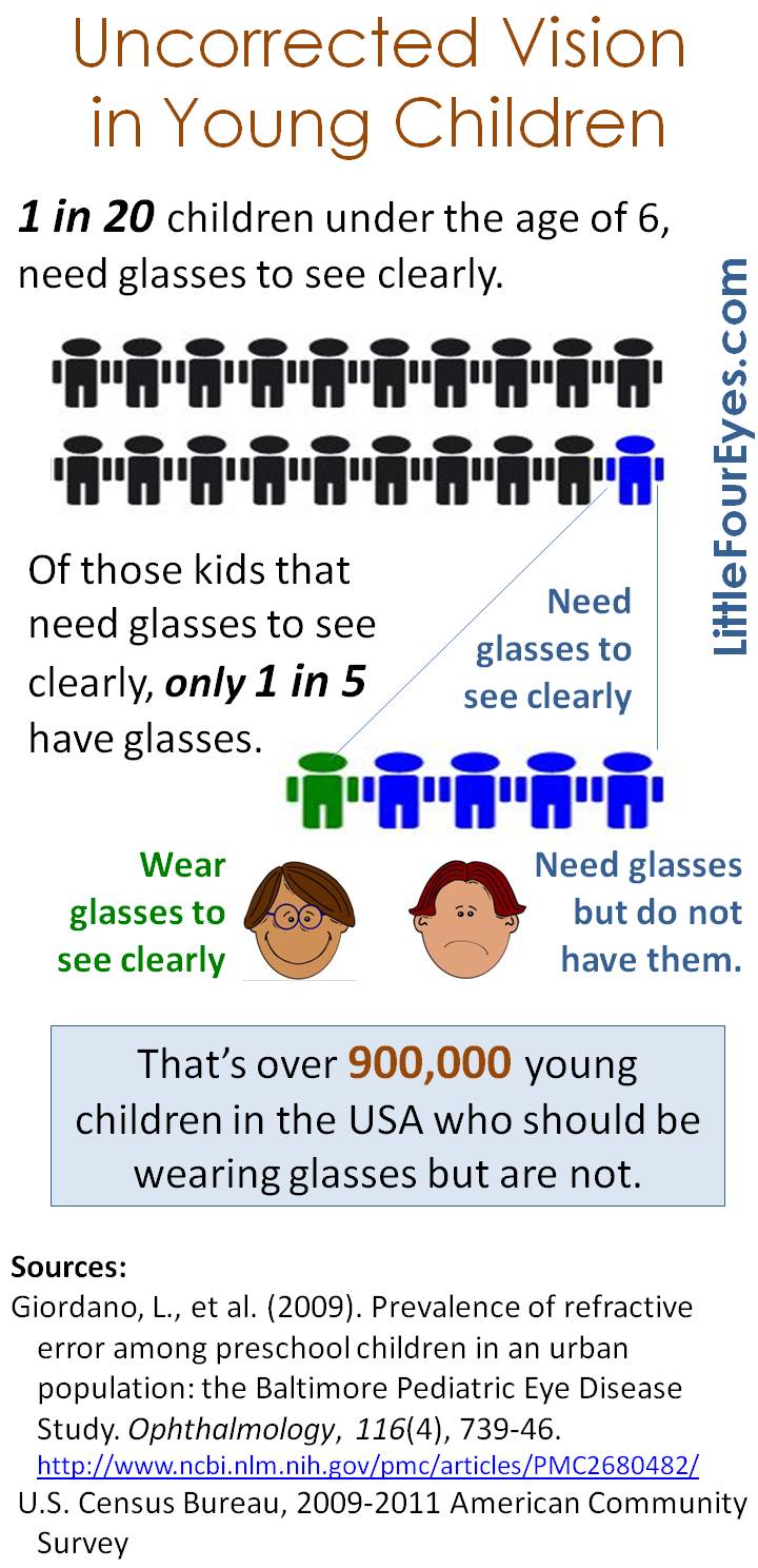 And if you think that’s bad, there are studies that show an even bleaker picture: According to a study of first graders in California published in 2011, 8% of those children should be wearing glasses. Less than 1/2 of one percent of those children who need them had glasses.