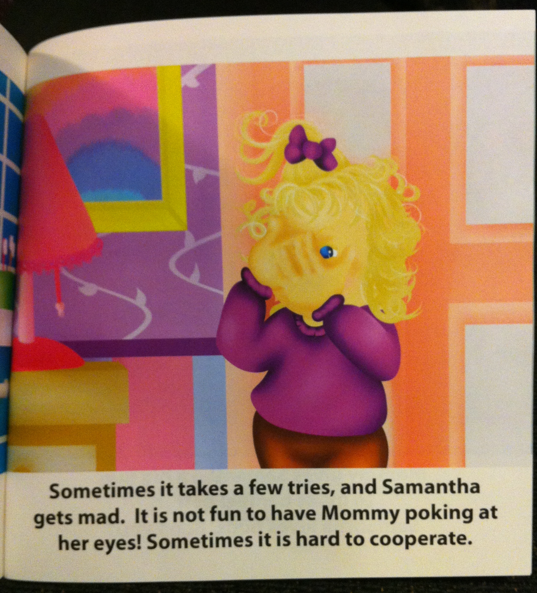This isn’t to say that the book sugar-coats patching or contact-wearing. Samantha gets mad when her mom has trouble removing her contact, something I imagine most kids and parents reading the book will relate to. I found myself laughing when the contact was correctly put in or removed, and Samantha’s response was, “Not so bad!!”