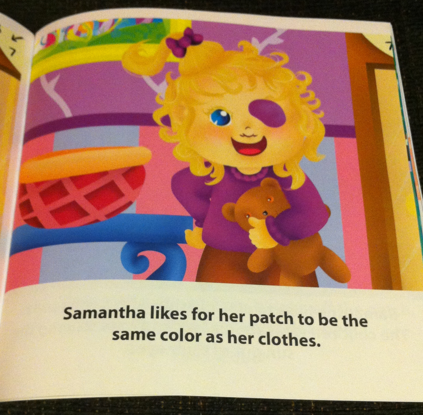 In Juliette Vignola’s book, “Samantha Wears a Contact Lens and a Patch,” we get to see a day in the life of Samantha. She is a happy girl, whose day includes having her mom put in her contact and patching. But neither of those activities are portrayed as being something strange, rather they’re simply presented as a normal part of her day. It’s very refreshing to find a book which simply incorporates these as a day to day activity. Most aphakic kids do not remember a time before contacts or patching, so even if they’re a struggle, they’re still a part of of their daily life. The book is also peppered with questions to the audience, “Does your mommy or daddy put your contact lens in for you?” The questions further normalize the experiences of the young readers, helping them feel less alone.