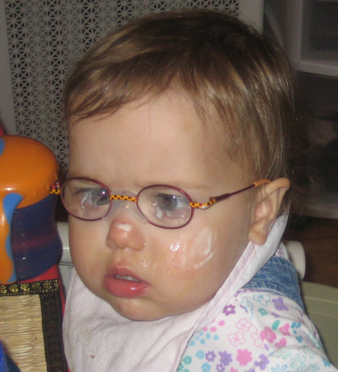 Even now, this photo makes me want to run and get a glasses cleaning cloth. The glasses stay so much cleaner! Now that she has learned to eat without getting food all over her body, her glasses don’t get nearly as dirty. And she is old enough to know how to clean her glasses herself.