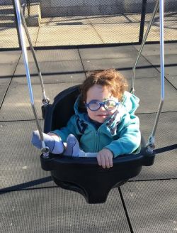 Noah today. [Image: toddler boy in a swing wearing glasses and a patch.]