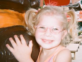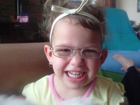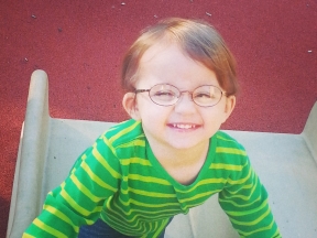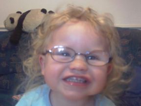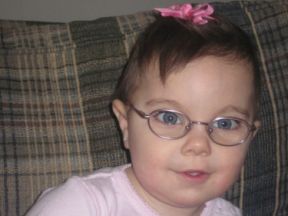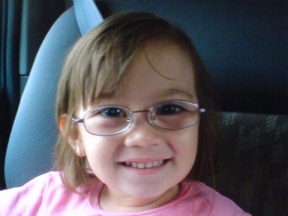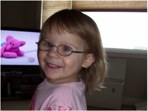 Presley, 2 1/2 years old. She wears glasses for farsightedness. Glasses are Dora-style from Walmart