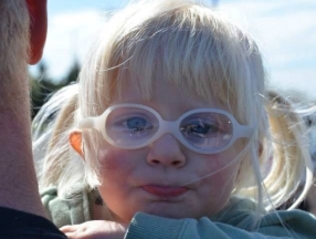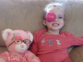 Jacie, 2 1/2 years old. She wears glasses for farsightedness and astigmatism, and patches.