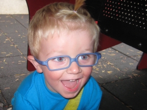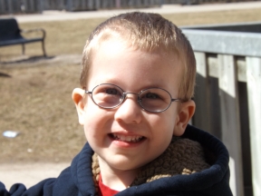 Reid, 3 years old. He wears glasses for farsightedness. The glasses in this picture are +6 prescription. He now has bifocals.