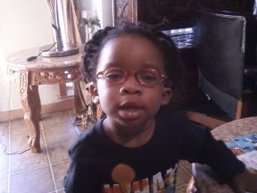 Emani, 2 years old. He wears glasses for farsightedness and aniridia. Frames are Nickelodeon purchased at WalMart Optical.