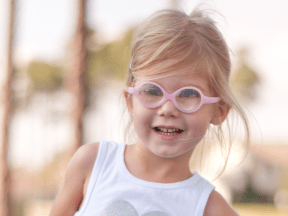 Dylan – 3 years old. She wears glasses for accommodative esotropia. Frames are Miraflex.
