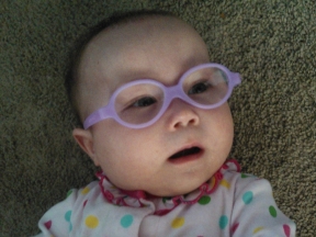Kathryn, 10 months old. Wears glasses for farsightedness (+9) and Accomodative Esotropia. First day in her new Miraflex frames.
