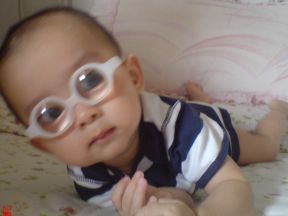 Karam, 5 months old. He wears glasses for bilateral cataracts.