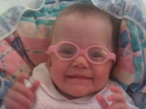 Abrielle, 14 months. She wears glasses for farsightedness and esotropia. Glasses are from Walmart.