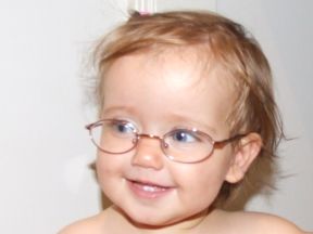 Paris, 14 months – wears glasses for anisometropia. She is minus three in her right eye, plano in the left. So the eye wanders out when she is focusing on something in the distance. Glasses from Sunshine Coast Australia